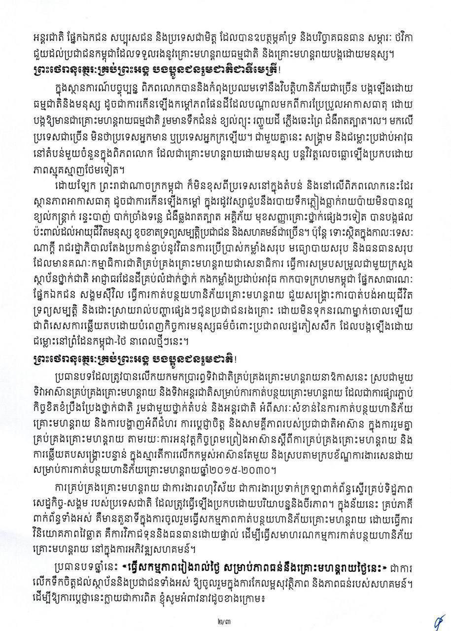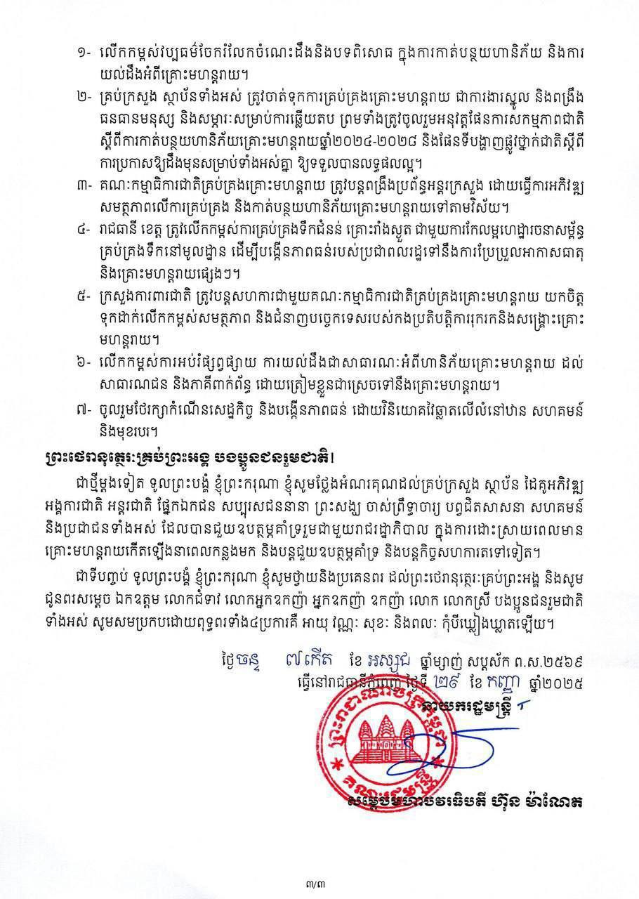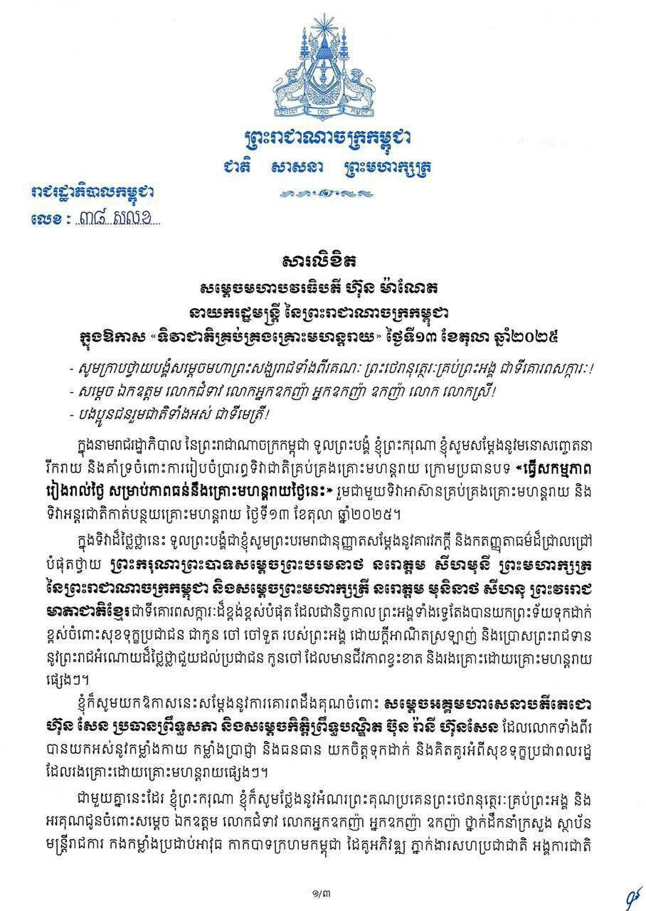សារលិខិត សម្តេចធិបតី ហ៊ុន ម៉ាណែត ក្នុងឱកាស «ទិវាជាតិគ្រប់គ្រងគ្រោះមហន្តរាយ»ភ្នំពេញ៖ សារលិខិត សម្តេចមហាបវរធិបតី ហ៊ុន ម៉ាណែត នាយករដ្ឋមន្ត្រី នៃព្រះរាជាណាចក្រកម្ពុជា ក្នុងឱកាស «ទិវាជាតិគ្រប់គ្រងគ្រោះមហន្តរាយ» ថ្ងៃទី១៣ ខែតុលា ឆ្នាំ២០២៥។