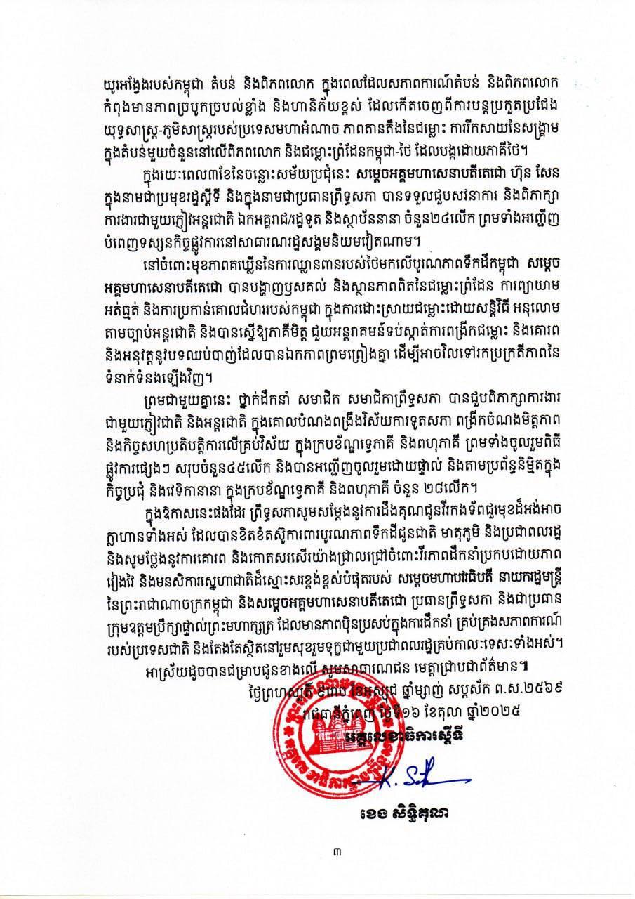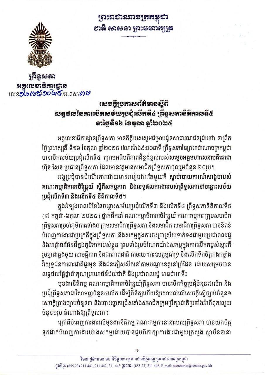 លទ្ធផលសម័យប្រជុំលើកទី៤ ព្រឹទ្ធសភា នីតិកាលទី៥!ភ្នំពេញ៖ ព្រឹទ្ធសភា បានចេញសេចក្តីប្រកាសព័ត៍មាន ស្តីពីលទ្ធផលសម័យប្រជុំលើកទី៤ ព្រឹទ្ធសភា នីតិកាលទី៥ ក្រោមអធិបតីភាពដ៏ខ្ពង់ខ្ពស់ សម្តេចអគ្គមហាសេនាបតីតេជោ ហ៊ុន សែន ប្រធានព្រឹទ្ធសភានៃព្រះរាជាណាចក្រកម្ពុជា នៅវិមានព្រឹទ្ធសភា រាជធានីភ្នំពេញ នាថ្ងៃទី១៦ ខែតុលា ឆ្នាំ២០២៥។