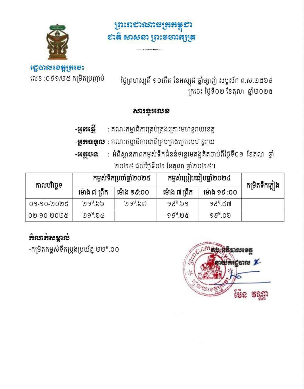 រដ្ឋបាលខេត្តក្រចេះ ជូនដំណឹងពីស្ថានភាពកម្ពស់ទឹកជំនន់ទន្លេមេគង្គគិតចាប់ពីថ្ងៃទី១-២ ខែតុលា