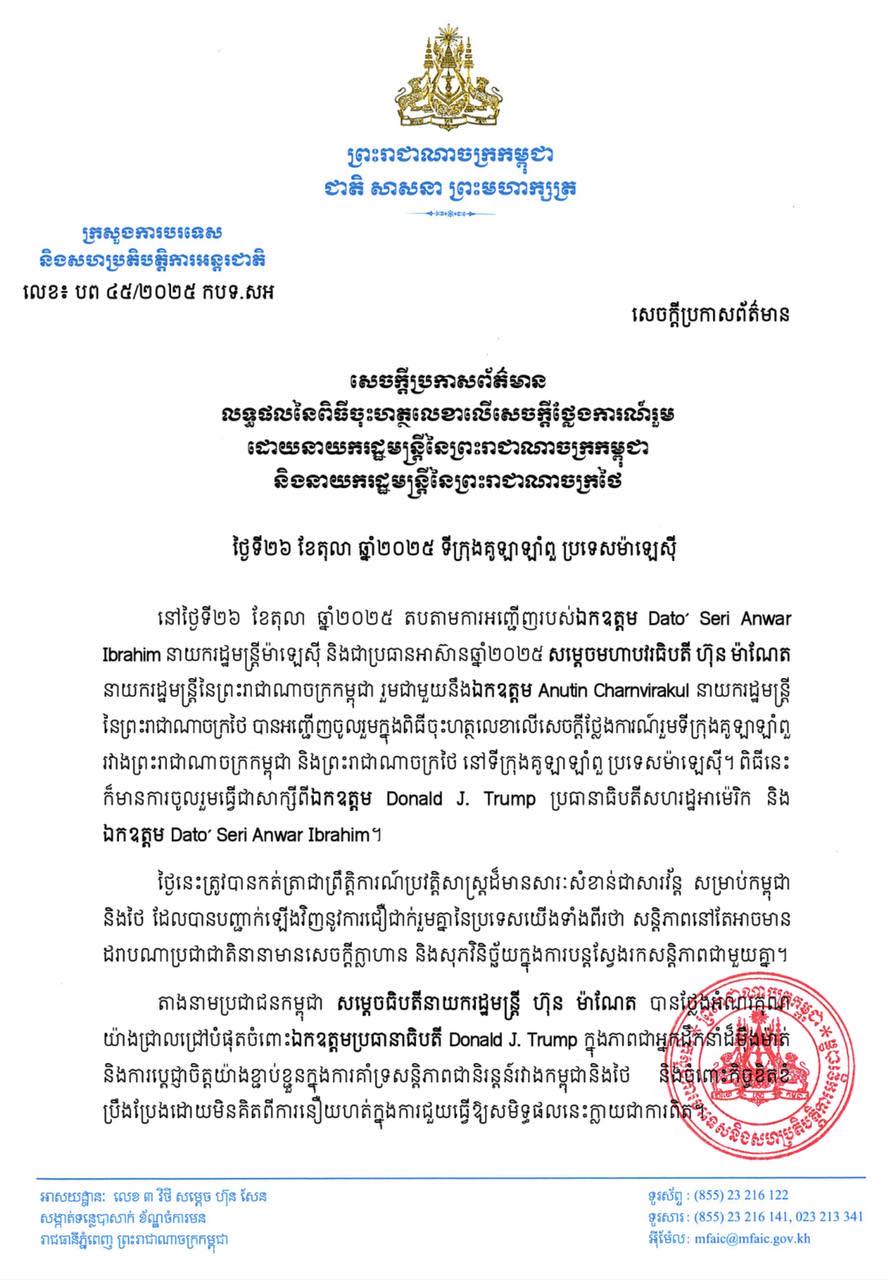 ក្រសួងការបរទេស ចេញសេចក្តីប្រកាសព័ត៌មានអំពីការចុះហត្ថលេខាលើសេចក្តីថ្លែងការណ៍រួម ដោយនាយករដ្ឋមន្ត្រីកម្ពុជា និងនាយករដ្ឋមន្ត្រីថៃ នៅទីក្រុងគូឡាឡាំពួ ដោយមានប្រធានាធិបតីអាមេរិក និងប្រធានអាស៊ានជាសាក្សី ()