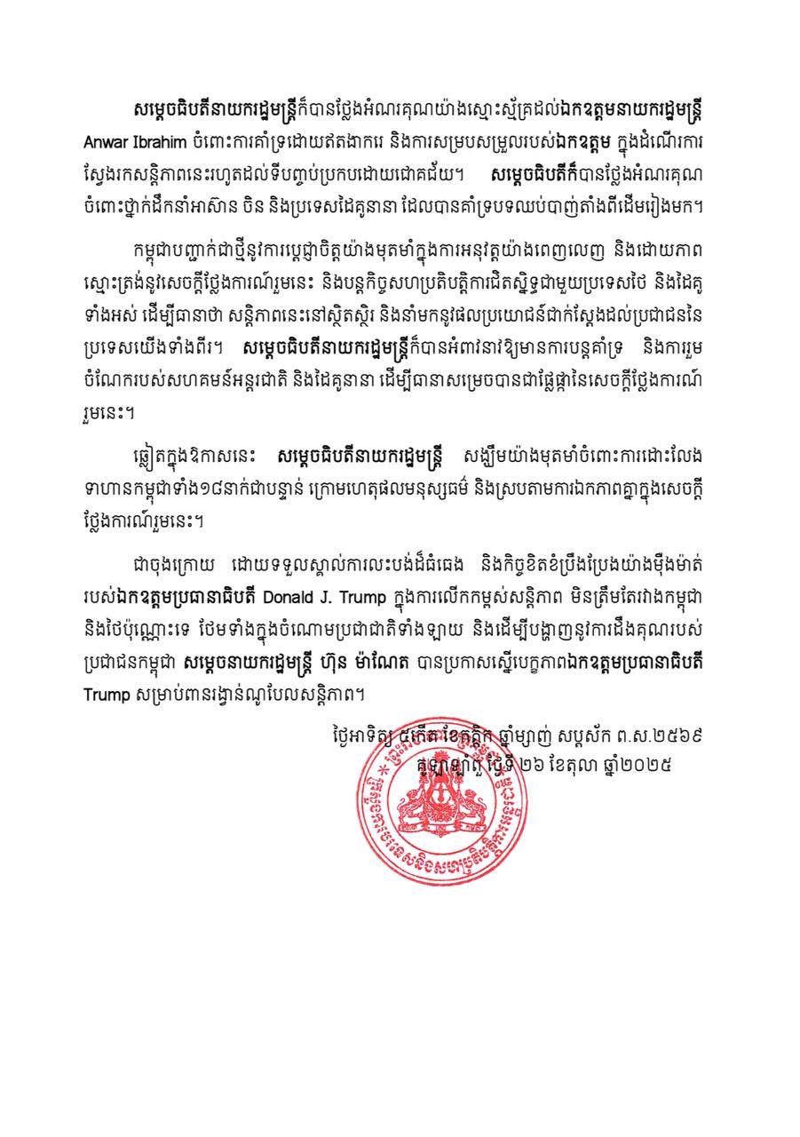 (ភ្នំពេញ)៖ ក្រសួងការបរទេស និងសហប្រតិបត្តិការអន្តរជាតិកម្ពុជា នៅមុននេះ បានចេញសេចក្តីប្រកាសព័ត៌មាន អំពីលទ្ធផល នៃពិធីចុះហត្ថលេខាលើសេចក្តីថ្លែងការណ៍រួម ដោយនាយករដ្ឋមន្ត្រីកម្ពុជា និងនាយករដ្ឋមន្ត្រីថៃ នៅទីក្រុងគូឡាឡាំពួ ដោយមានប្រធានាធិបតីអាមេរិក ដូណាល់ ត្រាំ និង នាយករដ្ឋមន្រ្តីម៉ាឡេស៊ីដែលជាប្រធានអាស៊ានជាសាក្សី។សេចក្តីប្រកាសរបស់ក្រសួងការបរទេស បានឱ្យដឹងថា នៅថ្ងៃទី២៦ ខែតុលា ឆ្នាំ២០២៥ តបតាមការអញ្ជើញរបស់ លោក Dato' Seri Anwar Ibrahim នាយករដ្ឋមន្ត្រីម៉ាឡេស៊ី និងជាប្រធានអាស៊ានឆ្នាំ២០២៥ សម្តេចមហាបវរធិបតី ហ៊ុន ម៉ាណែត នាយករដ្ឋមន្ត្រីកម្ពុជា រួមជាមួយនឹងលោក Anutin Charnvirakul នាយករដ្ឋមន្ត្រីថៃ បានចូលរួមក្នុងពិធីចុះហត្ថលេខាលើសេចក្តីថ្លែងការណ៍រួមទីក្រុងគូឡាឡាំពួ រវាងកម្ពុជា និងថៃ។ ពិធីនេះ ក៏មានការចូលរួមធ្វើជាសាក្សីពី លោក Donald J. Trump ប្រធានាធិបតីសហរដ្ឋអាម៉េរិក និង លោក Dato' Seri Anwar Ibrahim។ក្រសួងការបរទេស បានគូសបញ្ជាក់បន្ថែមថា ថ្ងៃនេះត្រូវបានកត់ត្រាជាព្រឹត្តិការណ៍ប្រវត្តិសាស្ត្រដ៏មានសារៈសំខាន់ជាសារវ័ន្តសម្រាប់កម្ពុជា និងថៃ ដែលបានបញ្ជាក់ឡើងវិញនូវការជឿជាក់រួមគ្នានៃប្រទេសយើងទាំងពីរថា សន្តិភាពនៅតែអាចមាន ដរាបណាប្រជាជាតិនានាមានសេចក្តីក្លាហាន និងសុភវិនិច្ឆ័យក្នុងការបន្តស្វែងរកសន្តិភាពជាមួយគ្នា។តាងនាមប្រជាជនកម្ពុជា សម្តេចធិបតី ហ៊ុន ម៉ាណែត បានថ្លែងអំណរគុណយ៉ាងជ្រាលជ្រៅបំផុតចំពោះ លោកប្រធានាធិបតី Donald J. Trump ក្នុងភាពជា និងការប្តេជ្ញាចិត្តយ៉ាងខ្ជាប់ខ្ជួនក្នុងការគាំទ្រសន្តិភាពជានិរន្តន៍រវាងកម្ពុជានិងថៃ និងចំពោះកិច្ចខិតខំប្រឹងប្រែងដោយមិនគិតពីការនឿយហត់ក្នុងការជួយធ្វើឱ្យសមិទ្ធផលនេះក្លាយជាការពិត។សម្តេចធិបតីនាយករដ្ឋមន្ត្រីក៏បានថ្លែងអំណរគុណយ៉ាងស្មោះស្ម័គ្រដល់ នាយករដ្ឋមន្ត្រីម៉ាឡេស៊ី Anwar Ibrahim ចំពោះការគាំទ្រដោយឥតងាករេ និងការសម្របសម្រួលរបស់លោកក្នុងដំណើរការ ស្វែងរកសន្តិភាពនេះរហូតដល់ទីបញ្ចប់ប្រកបដោយជោគជ័យ។ សម្តេចធិបតីក៏បានថ្លែងអំណរគុណ ចំពោះថ្នាក់ដឹកនាំអាស៊ាន ចិន និងប្រទេសដៃគូនានា ដែលបានគាំទ្របទឈប់បាញ់តាំងពីដើមរៀងមក។កម្ពុជាបញ្ជាក់ជាថ្មីនូវការប្តេជ្ញាចិត្តយ៉ាងមុតមាំក្នុងការអនុវត្តយ៉ាងពេញលេញ និងដោយភាព ស្មោះត្រង់នូវសេចក្តីថ្លែងការណ៍រួមនេះ និងបន្តកិច្ចសហប្រតិបត្តិការជិតស្និទ្ធជាមួយប្រទេសថៃ និងដៃគូ ទាំងអស់ ដើម្បីធានាថា សន្តិភាពនេះនៅស្ថិតស្ថិរ និងនាំមកនូវផលប្រយោជន៍ជាក់ស្តែងដល់ប្រជាជននៃ ប្រទេសយើងទាំងពីរ។ សម្តេចធិបតីនាយករដ្ឋមន្ត្រីក៏បានអំពាវនាវឱ្យមានការបន្តគាំទ្រ និងការរួម ចំណែករបស់សហគមន៍អន្តរជាតិ និងដៃគូនានា ដើម្បីធានាសម្រេចបានជា