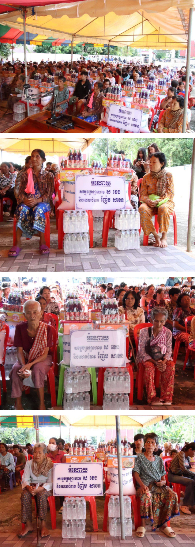 សូមបញ្ជាក់ថា អំណោយដែលចែកជូនប្រជាពលរដ្ឋចំនួន ១៣៥គ្រួសារ ដោយក្នុង១គ្រួសារទទួលបាន អង្ករ១ការ៉ុង មី១កេស ត្រីខ១យួរ ទឹកស៊ីអ៊ីវទឹកត្រី១យួរ ទឹកសុទ្ធ២យួរ និងកន្សែងពោះគោ១៕