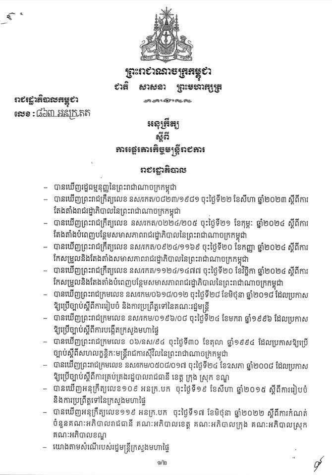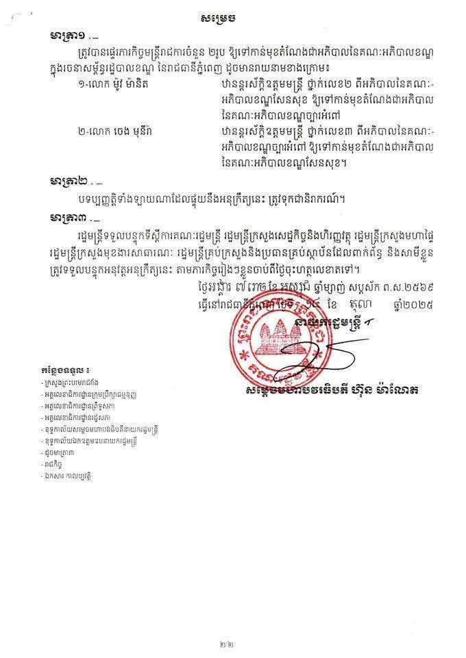 ភ្នំពេញ៖ លោក ចេង មុនីរ៉ា អភិបាលខណ្ឌច្បារអំពៅ ត្រូវបានផ្ទេរទៅជាអភិបាលខណ្ឌសែនសុខ, លោក ម៉ូវ ម៉ានិត អភិបាលខណ្ឌសែនសុខ ត្រូវបានផ្ទេរទៅជាអភិបាលខណ្ឌច្បារអំពៅ។ពិធីប្រកាសចូលកាន់តំណែងថ្មីនេះ ត្រូវបានធ្វើឡើងនៅថ្ងៃទី១៤ ខែវិច្ឆកា ឆ្នាំ២០២៥ ក្រោមអធិបតីភាព ឯកឧត្ដម ម៉ប់ សារិន ប្រធានក្រុមប្រឹក្សារាជធានីភ្នំពេញ និងឯកឧត្ដម ឃួង ស្រេង អភិបាលរាជធានីភ្នំពេញ។ក្រៅពីអភិបាលខណ្ឌដែលត្រូវប្រកាសចូលកាន់តំណែង ក្នុងពិធីនេះក៏មានការប្រកាសចូលកាន់តំណែងអភិបាលរងខណ្ឌមួយចំនួនផងដែរ៕