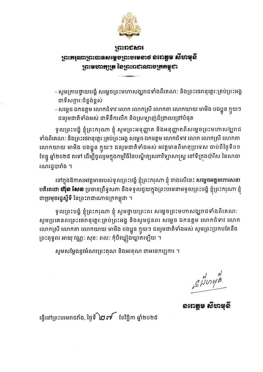 ក្នុងព្រះរាជសារផ្ញើជូនដល់ជនរួមជាតិ, ព្រះករុណាជាអម្ចាស់ជីវិតតម្កល់លើត្បូង បានមានព្រះរាជបន្ទូលឱ្យដឹងថា ក្នុងឱកាសដែលព្រះអង្គគង់ប្រថាប់នៅក្រៅប្រទេសនេះ សម្តេចអគ្គមហាសេនាបតីតេជោ ហ៊ុន សែន ប្រធានព្រឹទ្ធសភាកម្ពុជា នឹងទទួលជួយក្នុងព្រះបរមនាមរបស់ព្រះអង្គ ជាប្រមុខរដ្ឋស្តីទី ៕