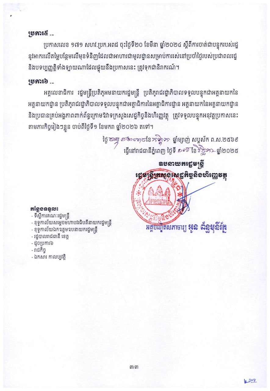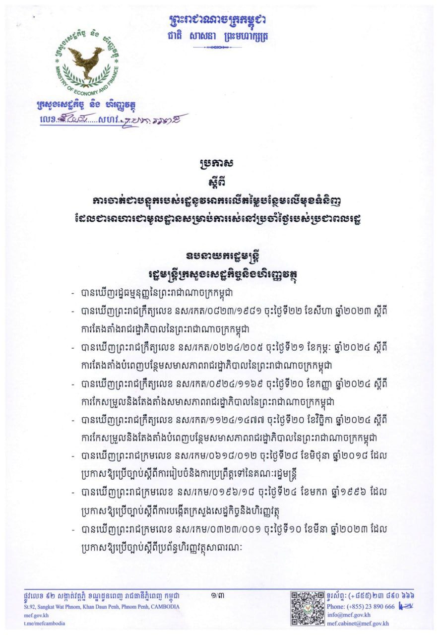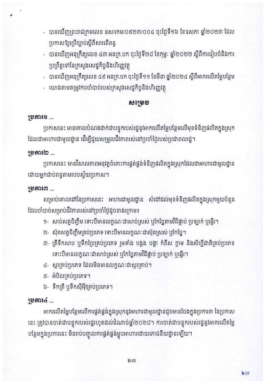 ភ្នំពេញ៖ ក្រសួងសេដ្ឋកិច្ច និងហិរញ្ញវត្ថុ ដែលជាសេនាធិការរបស់រាជរដ្ឋាភិបាលកម្ពុជា បានចេញប្រកាសដោយបន្តអនុគ្រោះអាការលើតម្លៃបន្ថែមលើមុខទំនិញ ដែលជាអាហារជាមូលដ្ឋានសម្រាប់ការរស់នៅប្រចាំថ្ងៃរបស់ប្រជាពលរដ្ឋ តាមរយៈការដាក់អាករនេះជាបន្ទុករបស់រដ្ឋ។