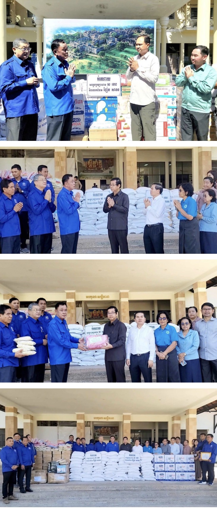 កេស កន្សែងពោះគោ២០០ អំបុក៤០០ថង់ ទឹកបរិសុទ្ធ១០០កេសធំ និងនំក្រៀម១០កេសធំ ម៉ាសការពារផ្សែងពុល១០០ប្រអប់ និងសម្ភារៈមួយចំនួនទៀត ចូលរួមចំណែកជាមួយរដ្ឋបាលខេត្តសៀមរាប និងខេត្តព្រះវិហារ ដើម្បីយកទៅចែកជូនជនភៀសសឹក និងវីរៈកងទ័ពជួរមុខ។