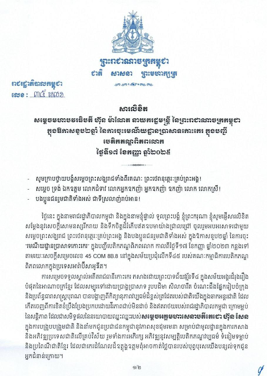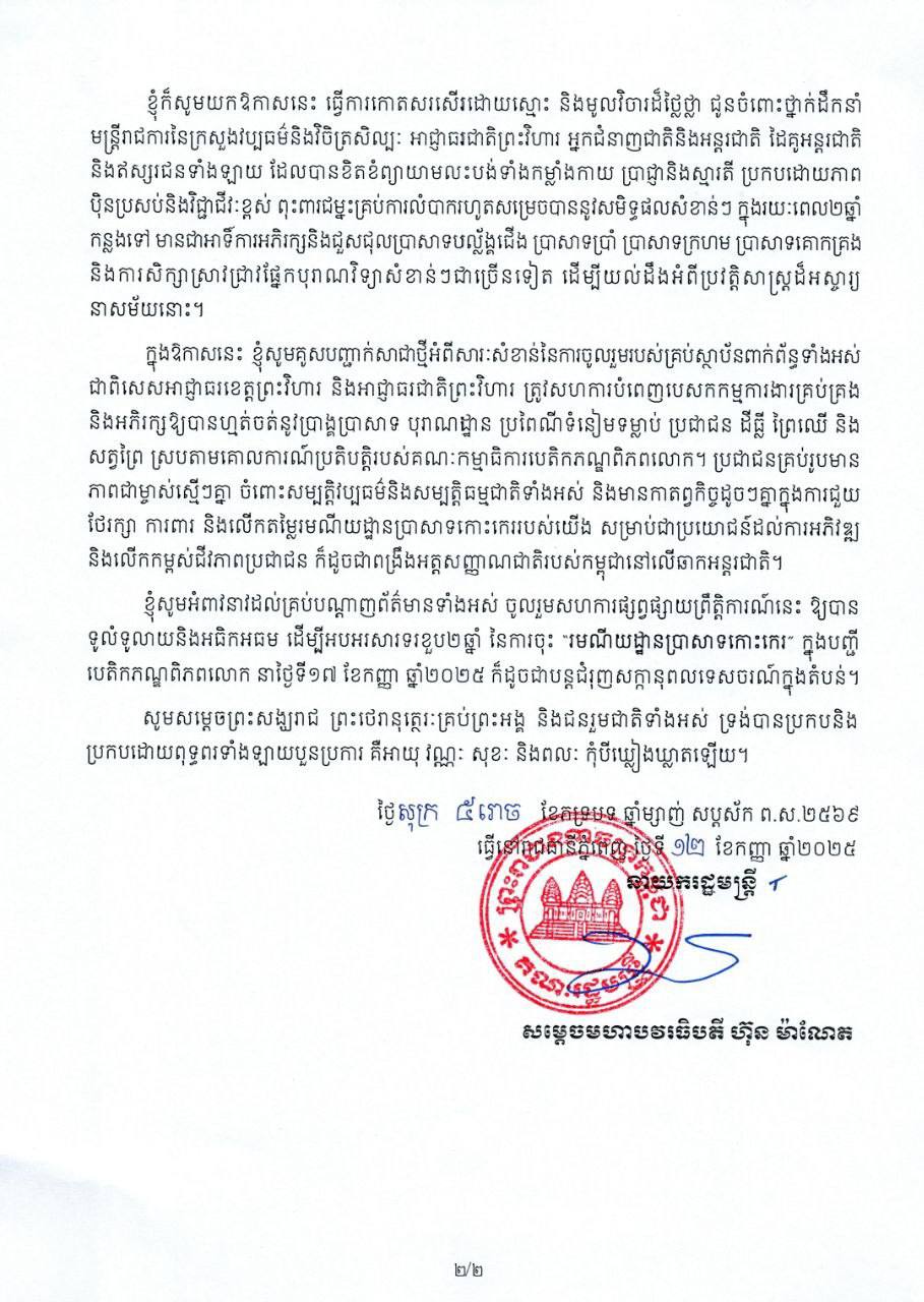 ភ្នំពេញ៖ សារលិខិត សម្តេចមហាបវរធិបតី ហ៊ុន ម៉ាណែត នាយករដ្ឋមន្ត្រី នៃព្រះរាជាណាចក្រកម្ពុជា ក្នុងឱកាសខួប២ឆ្នាំ នៃការចុះរមណីយដ្ឋានប្រាសាទកោះកេរ ក្នុងបញ្ជីបេតិកភណ្ឌពិភពលោក ថ្ងៃទី១៧ ខែកញ្ញា ឆ្នាំ២០២៥។