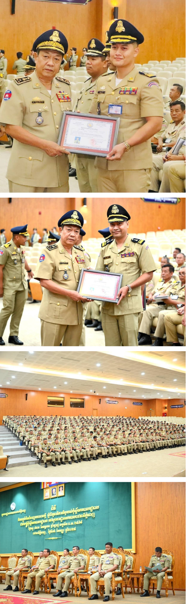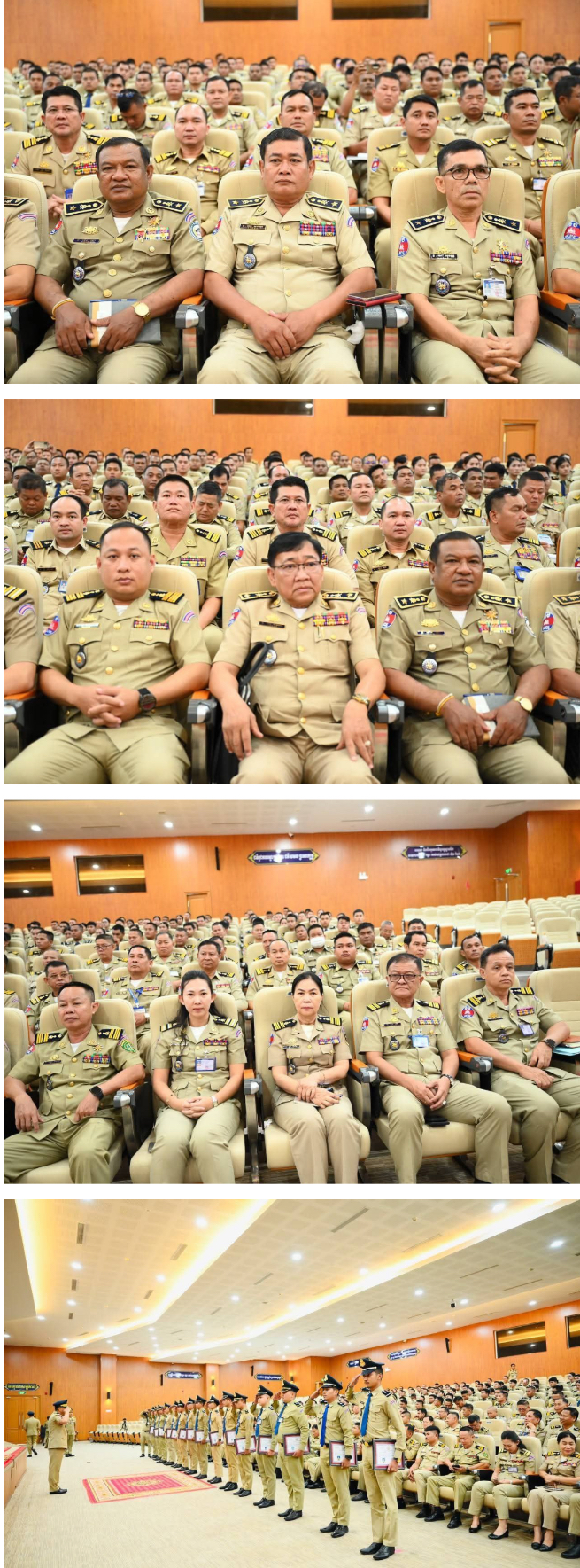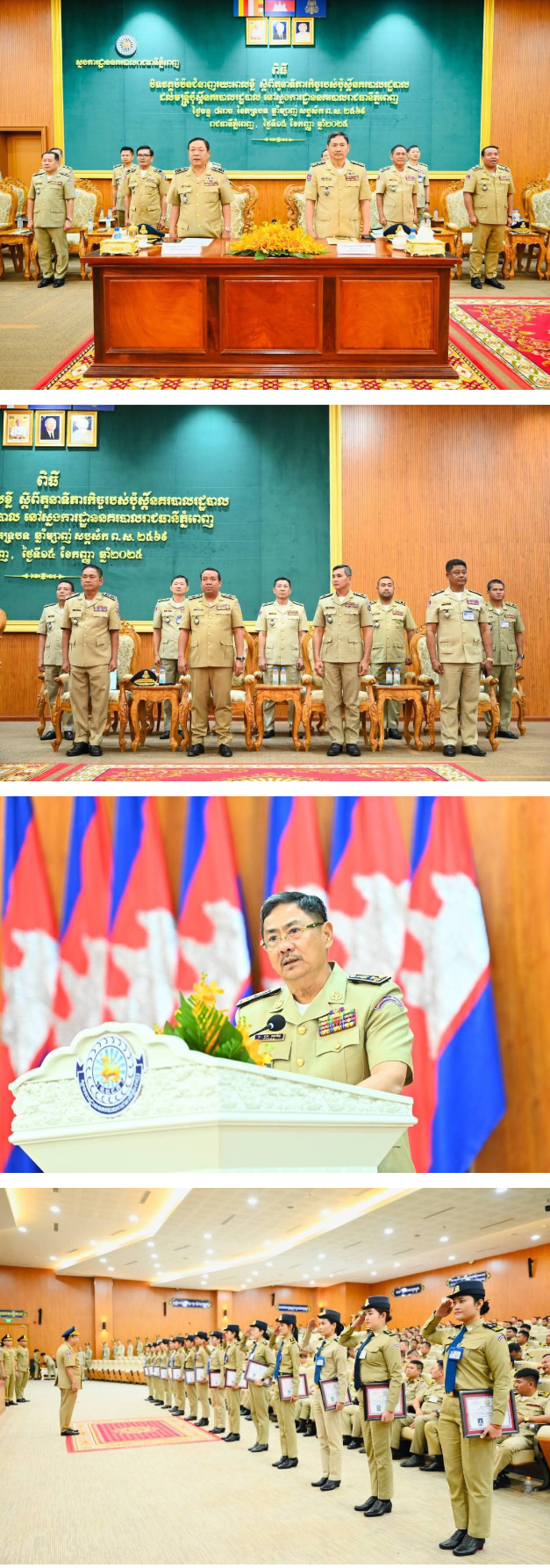 ភ្នំពេញ÷នៅរសៀលថ្ងៃទី១៥ ខែកញ្ញា ឆ្នាំ២០២៥ ឯកឧត្តម ឧត្តមសេនីយ៍ឯក ឆាយ គឹមខឿន អគ្គស្នងការរង និងឯកឧត្តម ឧត្តមសេនីយ៍ឯក ជួន ណារិន្ទ អគ្គស្នងការរង និងជាស្នងការនគរបាលរាជធានីភ្នំពេញ ដែលជាតំណាងដ៏ខ្ពង់ខ្ពស់ ឯកឧត្តម នាយឧត្តមសេនីយ៍ ស ថេត អគ្គស្នងការនគរបាលជាតិ បានអញ្ចើញជាអធិបតីពិធីបិទវគ្គបំប៉នជំនាញរយៈពេលខ្លី ស្តីពីតួនាទីភារកិច្ចរបស់ប៉ុស្តិ៍នគរបាលរដ្ឋបាល ដល់មន្ត្រីនគរបាលជាសិក្ខាកាម សរុប៣៣២នាក់។ពិធីនេះធ្វើឡើង នៅស្នងការដ្ឋាននគរបាលរាជធានីភ្នំពេញ ដោយមានការអញ្ជើញចូលរួមពី លោកប្រធាន អនុប្រធាននាយកដ្ឋាន ជាប្រតិភូអមដំណើរ , លោក-លោកស្រីស្នងការរង លោក-លោកស្រីនាយការិយាល័យជំនាញ លោកអធិការនគរបាលខណ្ឌទាំង១៤ លោកនាយប៉ុស្តិ៍នគរបាលទាំង១០៥។លោកឧត្តមសេនីយ៍ទោ មាស លឹមតុង ប្រធាននាយកដ្ឋានកិច្ចការប៉ុស្តិ៍នគរបាលរដ្ឋបាល បានឡើងអានរបាយការណ៍ ស្តីពីលទ្ធផល នៃកិច្ចការសិក្សាររយៈពេលខ្លី២សប្តាហ៍របស់សិក្ខាកាម ជូនដល់គណៈអធិបតីជ្រាប អំពីមេរៀនអនុវត្តការងារជំនាញជាក់ស្តែងនៅមូលដ្ឋាន សម្រាប់ឲ្យសិក្ខាកាមយកទៅអនុវត្តការងារប្រកបដោយប្រសិទ្ធភាព ។ឯកឧត្តម ឧត្តមសេនីយ៍ឯក ជួន ណារិន្ទ អគ្គស្នងការរង និងជាស្នងការនគរបាលរាជធានីភ្នំពេញ ឡើងមានមតិស្វាគមន៍យ៉ាងកក់ក្តៅ ចំពោះវត្តមានរបស់គណៈអធិបតី តំណាងដ៏ខ្ពង់ខ្ពស់ ឯកឧត្តម នាយឧត្តមសេនីយ៍ អគ្គស្នងការនគរបាលជាតិ ដែលបានចំណាយពេលអញ្ជើញ មកបិទវគ្គបំប៉នជំនាញជូនដល់សិក្ខាកាម នៅពេលនេះ ។ឯកឧត្តម ឧត្តមសេនីយ៍ឯក ជួន ណារិន្ទ អគ្គស្នងការរង និងជាស្នងការនគរបាលរាជធានីភ្នំពេញ ក៏សូមសម្តែងការវាយតម្លៃខ្ពស់ ចំពោះសិក្ខាកាមទាំងអស់ ដែលបានខិតខំប្រឹងប្រែងយកចិត្តទុកដាក់រៀនសូត្រ ប្រកបដោយលទ្ធផលជោគជ័យ ពិសេសសម្តែងការកោតសរសើរដល់គ្រូបង្គោលតាមជំនាញនីមួយៗទាំងអស់ ដែលបានផ្តល់បទពិសោធន៍ និងខំបង្ហាត់បង្រៀនចែករំលែកខឹ្លមសារមេរៀន ដល់សិក្ខាកាមទទួលបានការយល់ដឹងកាន់តែច្បាស់លាស់ ជាមូលដ្ឋានបំពេញការងារជំនាញឲ្យបានត្រឹមត្រូវ។ឯកឧត្តមស្នងការ ក៏បានផ្តល់បទពិសោធន៍មួយចំនួនដល់សិក្ខាកាម ទាំងកិច្ចការងារសន្តិសុខ និងការបង្ការទប់ស្កាត់បង្ក្រាបបទល្មើស ពិសេសនោះ គឺកិច្ចការងារផ្តល់សេវាសាធារណៈជូនប្រជាពលរដ្ឋ ឲ្យស្របតាមជំនាញ និងនីតិវិធី ព្រោះឯកសារសេវាតម្រូវការទាំងអស់ សុទ្ធតែជាឯកសារចាំបាច់ដែលពលរដ្ឋក្នុងសង្គមជាតិ យកទៅប្រើប្រាស់ ។ឯកឧត្តម ឧត្តមសេនីយ៍ឯក ឆាយ គឹមខឿន បានឡើងមានមតិណែនាំបន្ថែម និងផ្តល់នូវអនុសាសន៍សំខាន់ៗជាច្រើន ជូនដល់សិក្ខាកាមទាំងអស់ ដើម្បីជាទុន និងជាចំណេះដឹង សម្រាប់យកទៅប្រើប្រាស់ក្នុងពេលបំពេញភារកិច្ចការងារឲ្យចំទិសដៅ ។ឯកឧត្តម សូមឲ្យសិក្ខាកាម