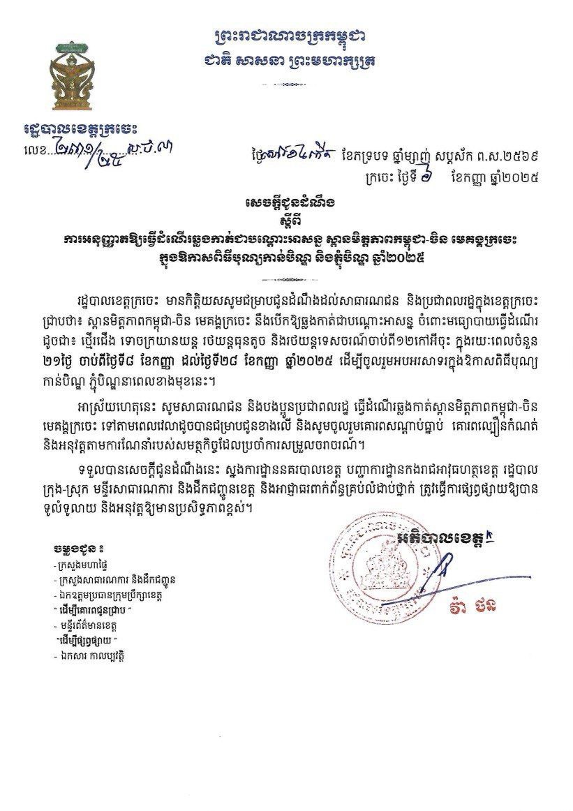 រដ្ឋបាលខេត្តក្រចេះ ចេញសេចក្តីជូនដំណឹង ស្តីពីការអនុញ្ញាតឱ្យធ្វើដំណើរឆ្លងកាត់ជាបណ្តោះអាសន្ន ស្ពានមិត្តភាពកម្ពុជា-ចិន មេគង្គក្រចេះ ក្នុងឱកាសពិធីបុណ្យកាន់បិណ្ឌ និងភ្ជុំបិណ្ឌ ឆ្នាំ២០២៥