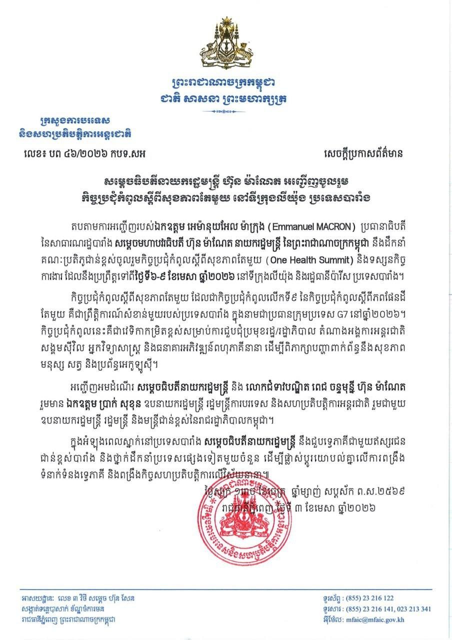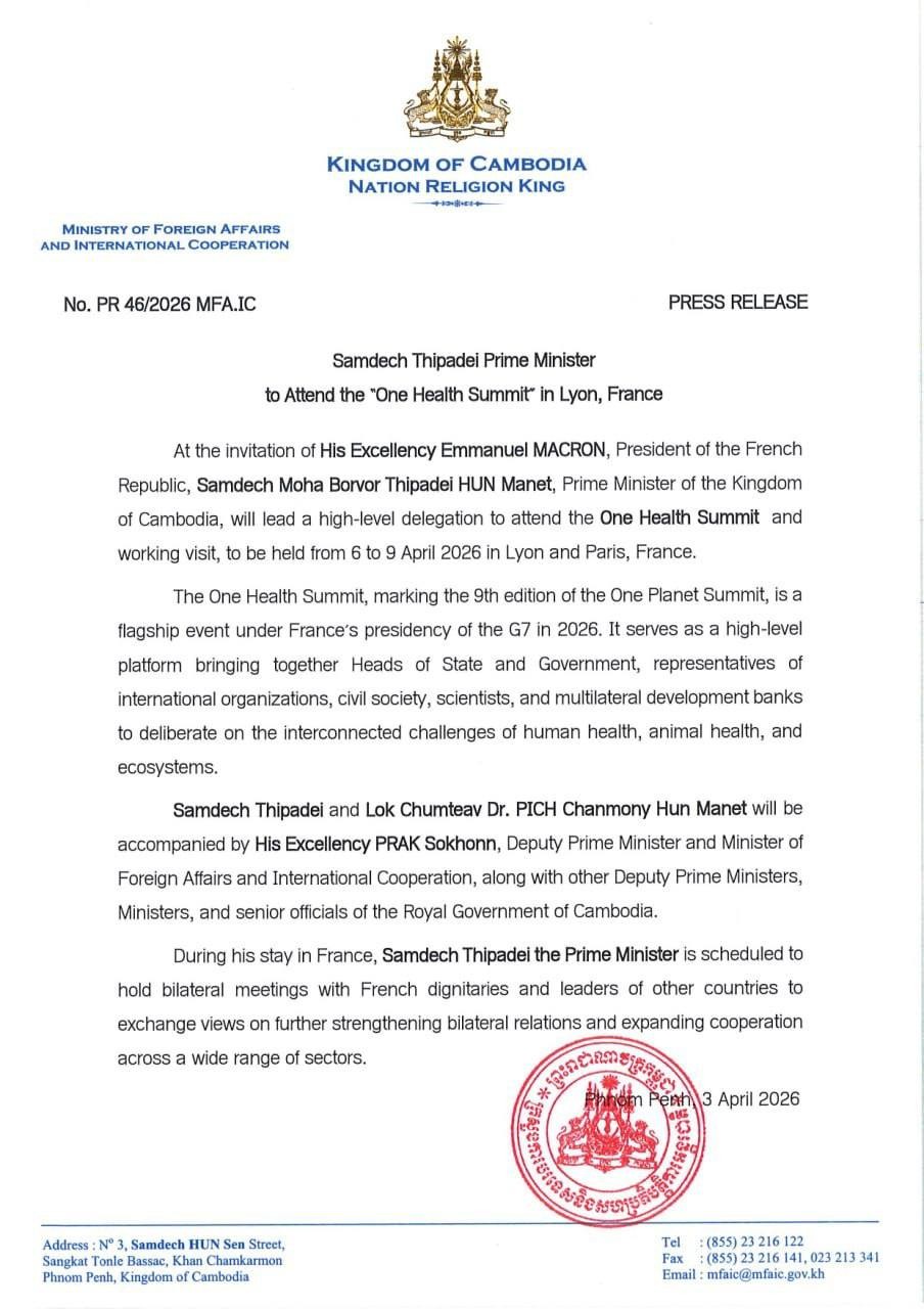 ភ្នំពេញ៖ តបតាមការអញ្ជើញរបស់លោក អេម៉ានុយអែល ម៉ាក្រុង (Emmanuel MACRON) ប្រធានាធិបតី នៃសាធារណរដ្ឋបារាំង សម្តេចមហាបវរធិបតី ហ៊ុន ម៉ាណែត នាយករដ្ឋមន្ត្រី នៃព្រះរាជាណាចក្រកម្ពុជា នឹងដឹកនាំ គណៈប្រតិភូជាន់ខ្ពស់ចូលរួមកិច្ចប្រជុំកំពូលស្តីពីសុខភាពតែមួយ (One Health Summit) និងទស្សនកិច្ច ការងារ ដែលនឹងប្រព្រឹត្តទៅពីថ្ងៃទី៦-៩ ខែមេសា ឆ្នាំ២០២៦ នៅទីក្រុងលីយ៉ុង និងរដ្ឋធានីប៉ារីស ប្រទេសបារាំង។ នេះបើយោងតាមសេចក្ដីប្រកាសព័ត៌មានរបស់ក្រសួងការបរទេស និងសហប្រតិបត្តិការអន្តរជាតិ។កិច្ចប្រជុំកំពូលស្តីពីសុខភាពតែមួយ ដែលជាកិច្ចប្រជុំកំពូលលើកទី៩ នៃកិច្ចប្រជុំកំពូលស្តីពីភពផែនដី តែមួយ គឺជាព្រឹត្តិការណ៍សំខាន់មួយរបស់ប្រទេសបារាំង ក្នុងនាមជាប្រធានក្រុមប្រទេស G7 នៅឆ្នាំ២០២៦។កិច្ចប្រជុំកំពូលនេះ គឺជាវេទិកាកម្រិតខ្ពស់សម្រាប់ការជួបជុំប្រមុខរដ្ឋ/រដ្ឋាភិបាល តំណាងអង្គការអន្តរជាតិ សង្គមស៊ីវិល អ្នកវិទ្យាសាស្ត្រ និងធនាគារអភិវឌ្ឍន៍ពហុភាគីនានា ដើម្បីពិភាក្សាបញ្ហាពាក់ព័ន្ធនឹងសុខភាព មនុស្ស សត្វ និងប្រព័ន្ធអេកូឡូស៊ី។អញ្ជើញអមដំណើរ សម្តេចធិបតីនាយករដ្ឋមន្ត្រី និង លោកជំទាវបណ្ឌិត ពេជ ចន្ទមុន្នី ហ៊ុន ម៉ាណែត រួមមាន ឯកឧត្ដម ប្រាក់ សុខុន ឧបនាយករដ្ឋមន្ត្រី រដ្ឋមន្ត្រីការបរទេស និងសហប្រតិបត្តិការអន្តរជាតិ រួមជាមួយ ឧបនាយករដ្ឋមន្ត្រី រដ្ឋមន្ត្រី និងមន្ត្រីជាន់ខ្ពស់នៃរាជរដ្ឋាភិបាលកម្ពុជា។ក្នុងអំឡុងពេលស្នាក់នៅប្រទេសបារាំង សម្តេចធិបតីនាយករដ្ឋមន្ត្រី នឹងជួបទ្វេភាគីជាមួយឥស្សរជនជាន់ខ្ពស់បារាំង និងថ្នាក់ដឹកនាំប្រទេសផ្សេងទៀតមួយចំនួន ដើម្បីផ្លាស់ប្តូរយោបល់គ្នាលើការពង្រឹង ទំនាក់ទំនងទ្វេភាគី និងពង្រឹងកិច្ចសហប្រតិបត្តិការលើវិស័យនានា៕
