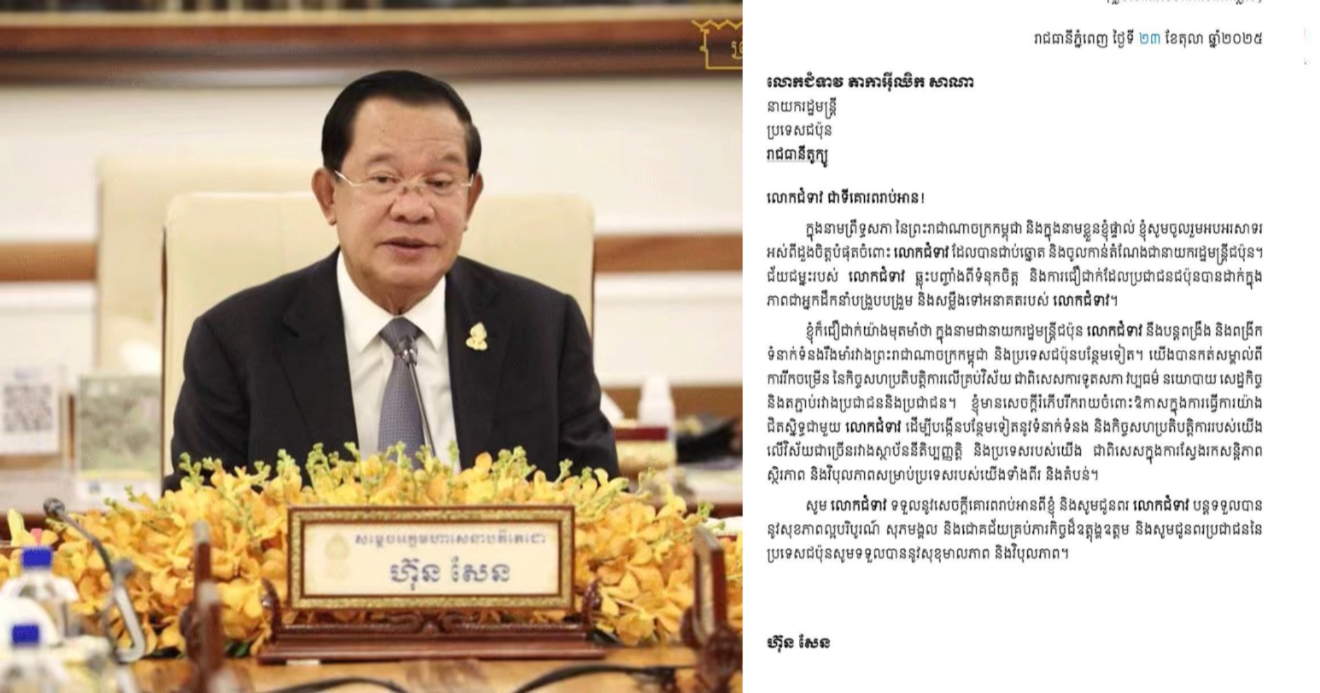 ភ្នំពេញ៖ សម្តេចតេជោ ហ៊ុន សែន ប្រធានព្រឹទ្ធសភានៃព្រះរាជាណាចក្រកម្ពុជា បានផ្ញើសារលិខិតអបអរសាទរជូនលោកស្រី Takaichi Sanae ក្នុងឱកាសដែលលោកជំទាវបានជាប់ឆ្នោត និងចូលកាន់តំណែងជានាយករដ្ឋមន្ត្រីថ្មី របស់ប្រទេសជប អានបន្ត