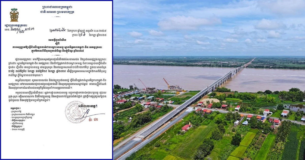 រដ្ឋបាលខេត្តក្រចេះ ចេញសេចក្តីជូនដំណឹង ស្តីពីការអនុញ្ញាតឱ្យធ្វើដំណើរឆ្លងកាត់ជាបណ្តោះអាសន្ន ស្ពានមិត្តភាពកម្ពុជា-ចិន មេគង្គក្រចេះ ក្នុងឱកាសពិធីបុណ្យកាន់បិណ្ឌ និងភ្ជុំបិណ្ឌ ឆ្នាំ២០២៥