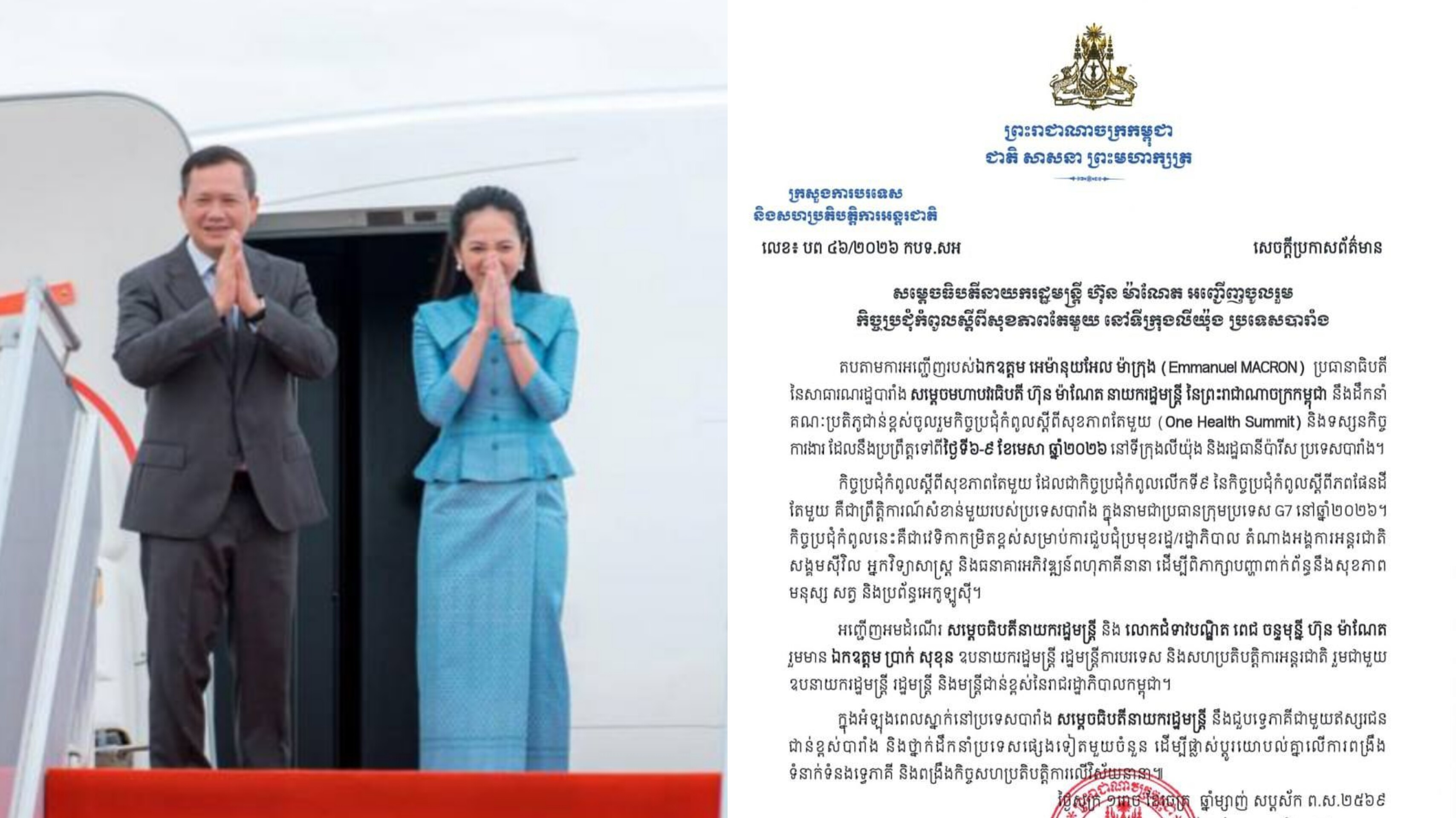 សម្តេចធិបតី នឹងអញ្ជើញចូលរួម កិច្ចប្រជុំកំពូលស្តីពីសុខភាពតែមួយ នៅទីក្រុងលីយ៉ុង ប្រទេសបារាំង ចាប់ពីថ្ងៃទី៦-៩ ខែមេសា